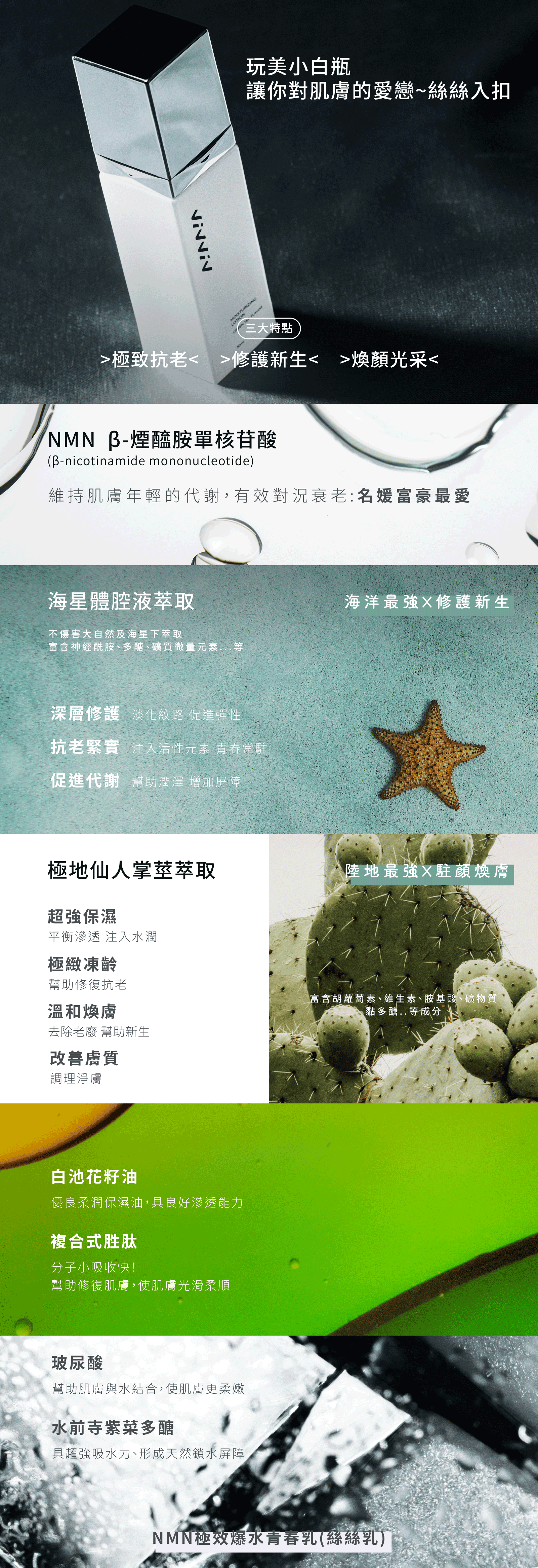 - 不傷害大自然及海星下萃取,富含神經酰胺、多醣、礦質微量元素…等
